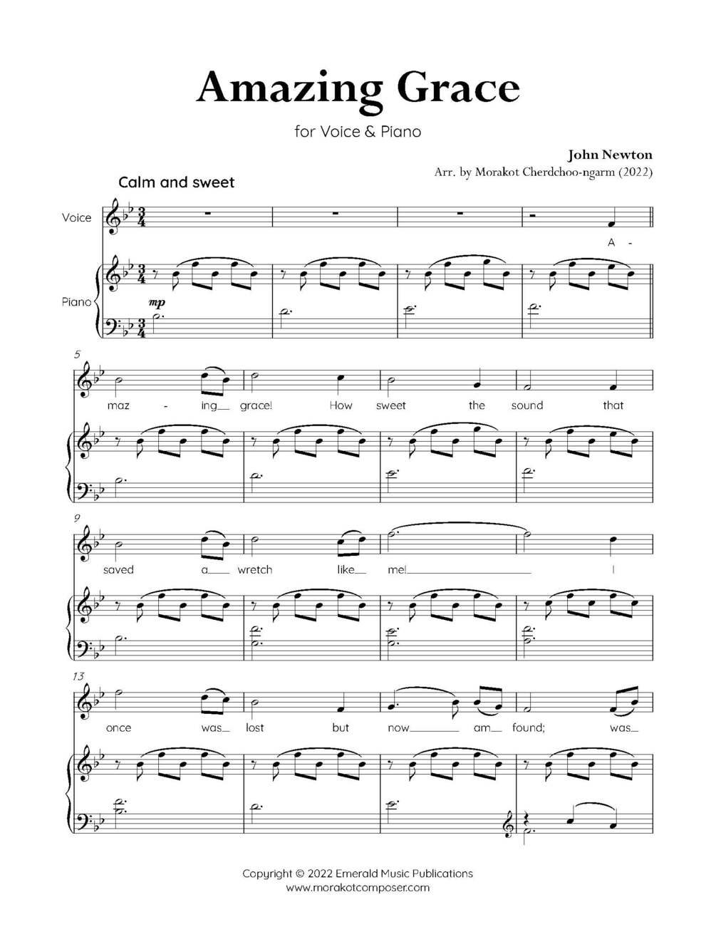 AMAZING GRACE for Voice & Piano (B-flat Major) High Voice